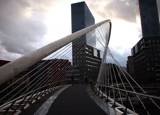 Und weil genau hier rostiger Stahl so gut ins Bild passt, haben Soriani und Palacio diesen gleich verwendet, um die Euskalduna Jauregia, ein Mehrzweck Kultur- und Ausstellungszentrum, welches auch die Oper beherbergt, stilvoll einzukleiden. Weiter geht´s mit der Bibliothek der Universität von Deusta des Architekturstars Rafael Moneo, dem Iberdrola Tower von Cesar Pelli, am Guggenheim vorbei unter der von Daniel Buren diesem stilistisch angepassten La Salvia Brücke durch zu den `Torres Isozaki´. Den Namen haben sie einerseits von ihrem Architekten Arata Isozaki, abgesehen davon bedeutet `isozaki´ auf baskisch `Tor´, was deren Funktion als Entreé hinauf in die Stadt entspricht, verbunden mit dem rechten Ufer durch eine weitere Brücke. Die ist unschwer als weiteres Werk Calatravas erkennbar, nicht nur wegen ihrer geschwungenen Form, sondern auch weil, wie auf fast allen Brücken dieses Architekten, ein nachträglich aufgebrachter Spannteppich verhindern soll, dass deren Benutzer bei Regen verunglücken.
