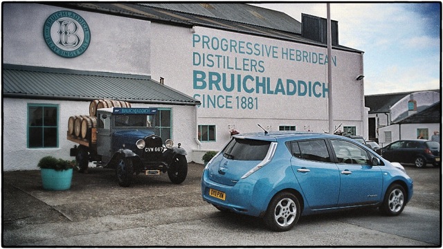 Während wir uns gewissenhaft Einblick in die Ergebnisse der Arbeit der Mälzer und Brenner verschaffen und die Aromen von Torf und Jod unsere Nasen und Gaumen erfreuen wird der Nissan Leaf von den letzten Spuren unseres Ausflugs in die schottische Landwirtschaft gesäubert, bald wird man davon kaum noch etwas riechen. Wir haben im Laufe des Tages praktisch vergessen, dass wir in einem Elektroauto unterwegs waren, und obwohl ich fast immer die Freuden des elektrischen Drehmoments ausgekostet habe, würden wir es laut Reichweitenanzeige noch locker bis ans Festland schaffen. Was aber total widersinnig wäre, bieten einem die `Progressive Hebriden Distillers´ in Bruichladdich doch alles, was man für sein Glück braucht: erstklassiges Lebenswasser und eine Steckdose!
