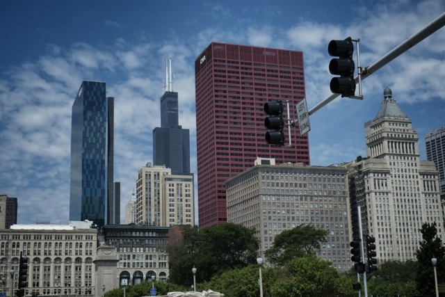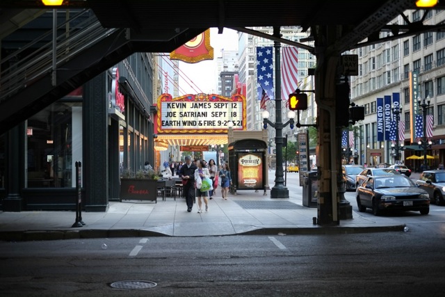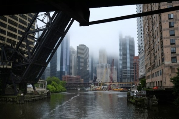 Mit ein, zwei feschen Ringerln fädelt sich der Kennedy Expressway schliesslich in die Stadt ein, der Sears, äh nun halt Willis Tower steht direkt daneben, an einem Fluss, der Turm kratzt, wie sich´s gehört, an den Wolken, der Fluss verkriecht sich zwischen Häuserschluchten, über die Strassen rattert die `L´, Elevated Railroad, also die O-Bahn quasi. Unter der Erde war kein Platz mehr, ausserdem musste es schnell gehen, die Stadt boomte Ende des neunzehnten Jahrhunderts ziemlich rasant, nachdem das grosse Feuer von 1871 circa 18.000 Gebäude vernichtet, hunderttausend Obdachlose zurückgelassen und ein ideales Exeperimentierfeld für die Stadtplanung geschaffen hatte.
