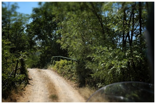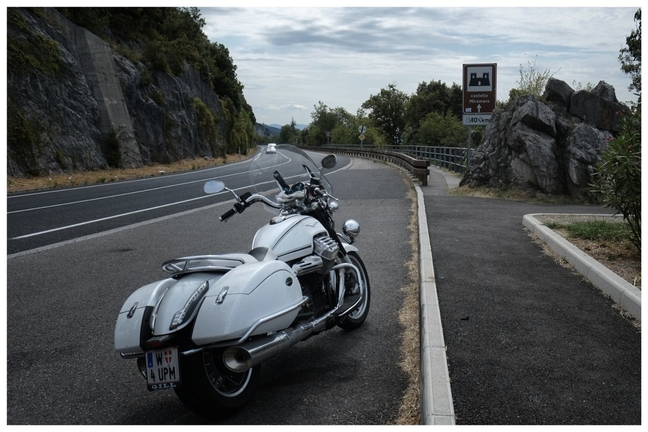 Zugegeben, eins zu hundertfünfzigtausend ist nicht unbedingt der Massstab einer Wanderkarte, so eine wäre angebracht gewesen, da wären dann wohl auch die farbigen Markierungen erklärt gewesen, landschaftlich war die Strecke aber eine der schönsten der gesammten Reise. Bergbauernhöfe hoch über dichten Wäldern auf steilen, saftig grünen Wiesen, im Hintergrund die schroffen Gipfel der karnischen Alpen, wunderbar, Gegenverkehr kaum, und wenn, dann in Form landwirtschaftlicher Selbstfahrer und ihrer minderjärigen Nachkommen auf knatternden Mopeds, Staubwolken hinter sich herziehend. Weil: nach kürzester Zeit waren nur mehr die Hofdurchfahrten asphaltiert, staubfrei gemacht, wie der Landwirt sagt, ansonsten zeigte sich die Piste nun geschottert, kein Problem, so lange es eben oder bergab dahin ging. An den wenigen Bergaufpassagen hatte die gute Guzzi California ihre liebe Mühe, nicht wegen mangelnder Leistung sondern wegen deren Überfluss, welchen die elektronische Antriebsschlupfregelung eifrig bekämpfte, im Extermfall bis kurz vor der totalen Zündungsabschaltung. Da hiess es vorausschauend fahren, nur nicht den Schwung verlieren, und doch nicht die halbe Tonne bergab aus der Kontrolle verlieren, ganz einfach, so, als ob man einen Dampfer durch´s Kinderbecken steuern würde.