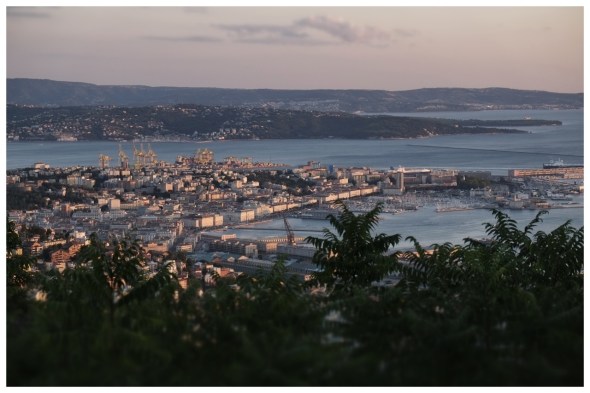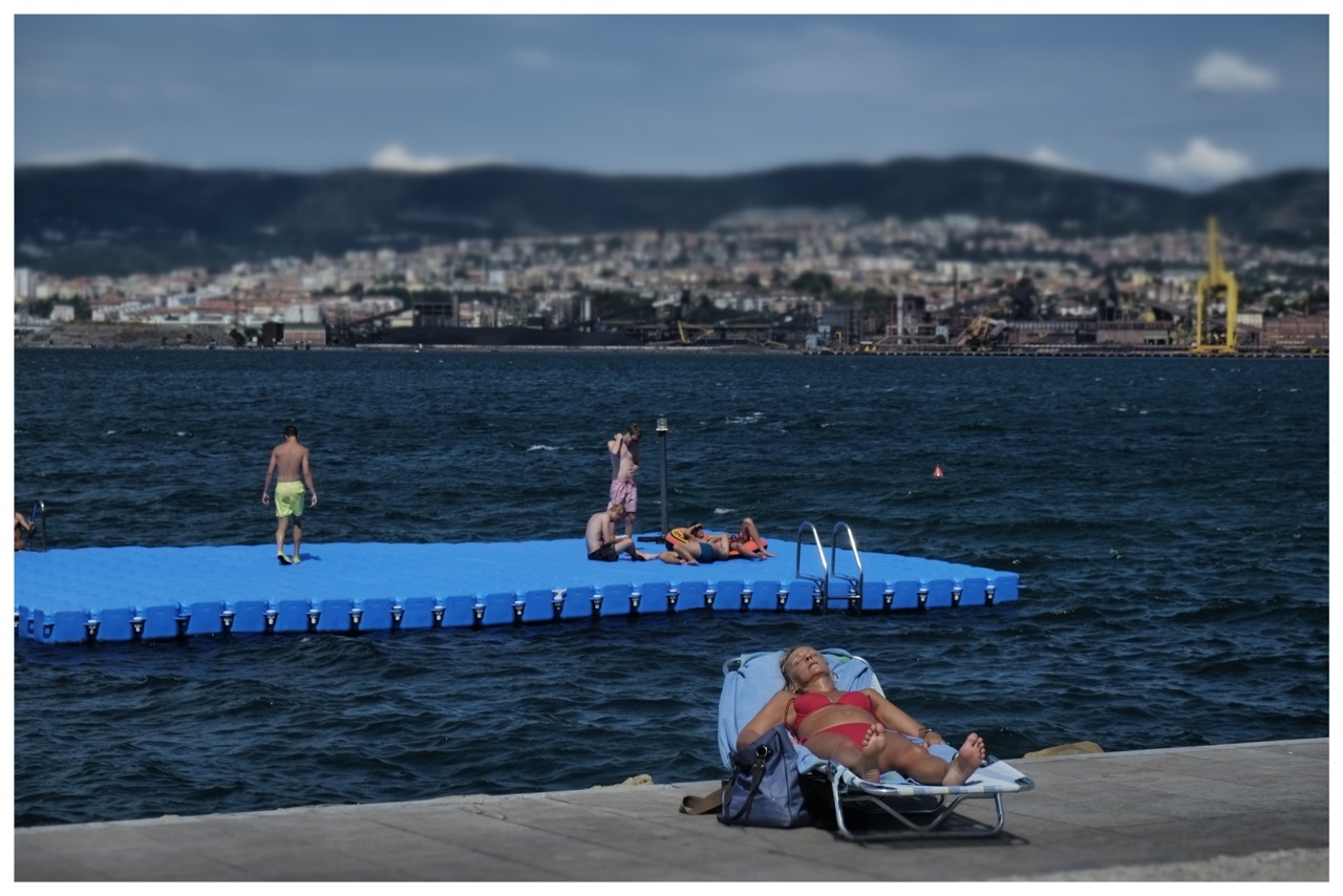 Die Einheimischen haben da schon weniger Probleme mit Idiomen und Grenzen, letztere sind kaum noch wahrnehmbar, nur die langen Schlangen italienischer nummerierter Kraftfahrzeuge an den Tankstellen hinter oder in den ehemaligen Zollstationen sind unübersehbar. Davor und dahinter, entlang der Küstenstrasse von Muggia über Lazzaretto nach Koper liegen die Menschen dicht gedrängt am schmalen Uferstreifen, nur die ermutigenden Zurufe der waghalsigen Kunstspringer lassen hin und wieder Rückschlüsse auf die Volksgruppenzugehörigkeit der halbstarken Burschen und der Objekte ihrer Begierde zu. In Koper versucht das noch immer junge Slowenien die industrielle Unansehnlichkeit des Triester Hafens an seinem einzigen Hochseezugang nachzubilden, bevor es südlich davon seinen fairen Teil vom Sommertourismuskuchen abzuschneiden trachtet.