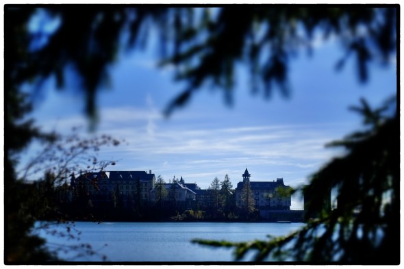 Der erste Blick aus dem Fenster anderntags bringt gleich ein atemberaubendes Panorama zum Vorschein, je nach Lage des Zimmers schaut man entweder über das weite Tal nch Süden zum endlosen sanften Gebirgszug der Niedern Tatra, oder auf die nahen schroffen Gipfel der Hohen Tatra. Die spiegeln sich im stillen See, einen architektonischen Kontrast setzt die stählern in der Morgensonne glänzende Sprungschanze, wie ein Denkmal des Arbeiterstaates ragt sie von einem Hügel weit aus dem Panorama, erinnert an die Nordische Schi Weltmeisterschaft des Jahres 1970, für welche sie errichtet wurde. Das tut auch das Hotel Patria, ein brutaler Protzbau, de facto ein schätzungsweise fünfzig Meter hoher Giebel, etwas schräg in die Landschaft gestellt, man kennt diese Irrtümer auch aus den französischen Alpen. Doch dieser Schandfleck verschwindet angesichts der schieren Schönheit der angezuckerten Gipfel vor dem strahlendblauen Himmel, wenig verwunderlich, dass am Wochenende Tausendschaften von Tieflandbewohnren hier herauf pilgern, mit PKWs, Bussen oder der Bahn, die den Ort bereits 1896 auch dem gemeinen Volk als Kurort zugänglich machte, schon seit 1875 genossen die hohen Herren das Reizklima in der Hohen Tatra, da hatte Jozef Szentivány seine Jagdhütte schon zum Gästehaus erweitern lassen. Seit 1906 stehen die Hotels Hviezdoslav und Kriván anspruchsvollen Gästen zur Verfügung, zusammen mit dem in den 1920er Jahren errichteten Sanatorium bilden sie nunmehr das Kempinski, besser war das Service wohl nie zuvor.