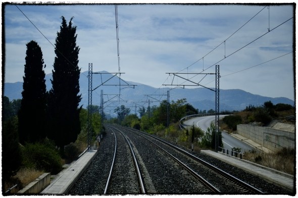Schon der Bahnhof in Athen, die Larissa Station, macht nicht gerade den Eindruck, man wollte einen besonders guten solchen machen, eher pragmatisch hat man das klassizistische Gebäude am einstigen Stadtrand den neuen Anforderungen angepasst. Rot-weisse Absperrbänder sollen Fahrgäste ohne Fahrschein abhalten, kontrolliert wird von mürrischen Beamten, die Wagons des Intercity sind, mit Ausnahme des Erste Klasse Wagens bunt besprayt, innen immerhin sauber, relativ modern und geräumig. Die Abfahrt erfolgt pünktlich, das Signal gibt ein Fahrdienstleiter mit Trillerpfeife, ganz klassisch.