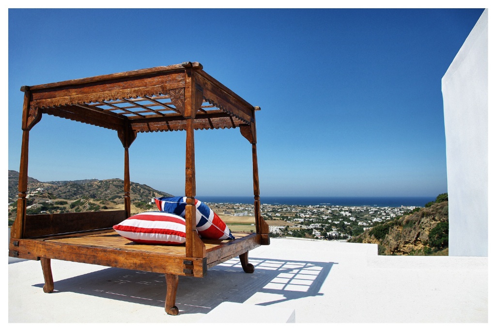 Die kommt spärlich, und das ist gut so, muss ja nicht immer so brummen wie Mykonos, Kos oder sonstige Hotspots, die karge Insel mitten im Meer drängt sich nicht auf, aber wenn man sie mal entdeckt hat, bleibt man leicht hängen. So wie Georgios Carabellas, der Unternehmer, Designer und Art Director kam 2008 eigentlich nur nach Skyros, um mit einem Künstler ein Projekt in Athen zu besprechen. Schon beim erstenAnblick erinnerte ihn die Insel an ein steinernes Schiff, das hier draussen in der Ägäis vor Anker liegt, und wo die Zeit still gestanden scheint. Der Hauptort, die Chora, liegt einem Amphitheater gleich am Hang des Burgberges beschützt vom Kloster des heiligen Georgs, durchschnitten von der Hauptstrasse, die zum zentralen `Platz der ewigen Poesie´ führt. Und überall diese typischen kleinen weissen malerischen Häuser, hier mit farbigen Dächern, wie im Bilderbuch, und dazu noch mit prachtvoller Aussicht weit hinaus zum Horizont.