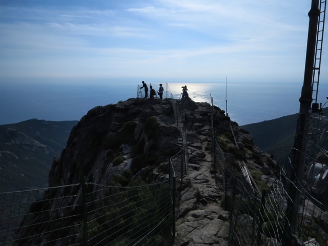 Den erreicht man auch mit einer atemberaubenden Seilbahn, die Gondeln sehen aus wie fragile gelbe Vogelkäfige, zwei Personen können knapp drin stehen, sollten sich aber auch mögen. Unten huschen Gemsen ganz ungeniert über die Geröllhalden, oben zwitschern die geschützten Vogerln. Oben am Gipfel drängt sich wieder Montechristo ins Bild, und die Direttoressa des Parco Naturale erklärt sich auch für diese zuständig, gehört sie doch auch zum Nationalpark. Auf Montechristo sind´s angeblich die raren endemischen Ziegen, wegen derer jährlich nur tausend Besucher Nachschau halten dürfen, ich übrigens wieder nicht.