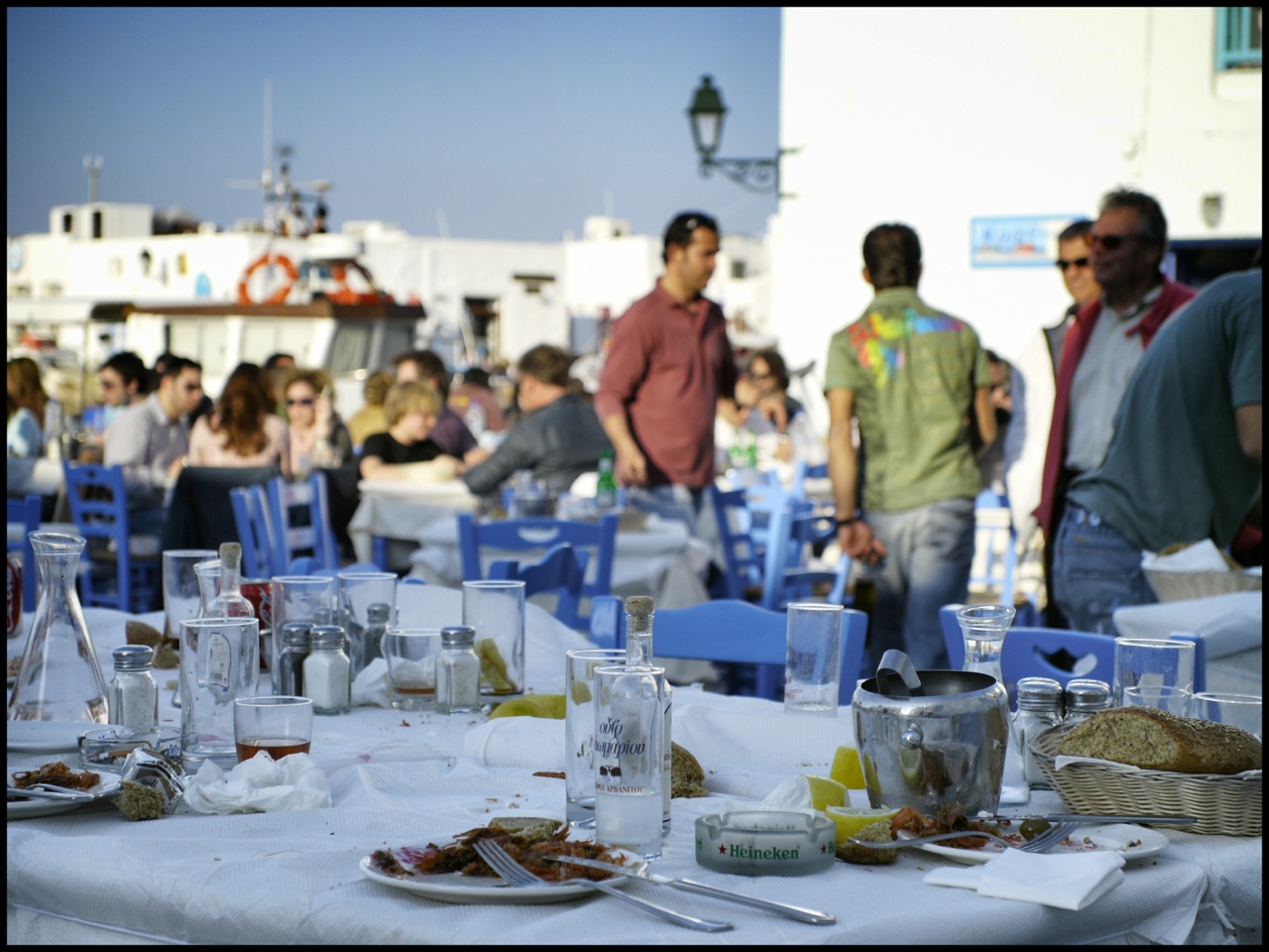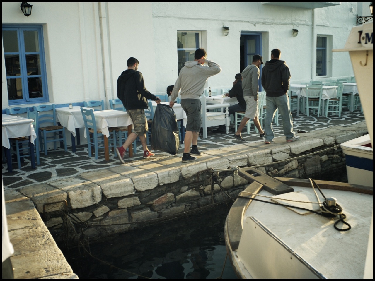 Über das Ende des endlosen Nachmittags gibt es anderntags nur wenige brauchbare Erinnerungen, doch ein Jeder weiss, dass es schön gewesen sein muss. Langsam wird gepackt, kurz nach sieben geht die Fähre, danach kehrt wieder Ruhe ein. Die Einheimischen kommen auch wieder ans Licht, kurz vor der Dämmerung versammeln sie sich im Hafen, beseitigen Spuren, ein Häufchen Unentwegter findet sich wieder im Shark ein, die Gassen sind erstaunlich leer. Bis zum Sommer, dann geht es weiter, mit dem Feiern auf Paros!