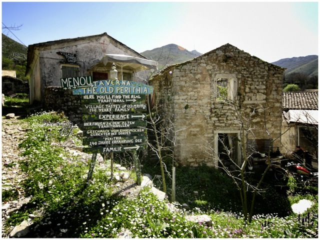 Also raus aus der Stadt, über die Serpentinen hinauf auf den Pantokrator, den höchsten Berg, leicht zu finden dank des Sendemastes, der in einem Kloster steht, den Ausblick auf die gesamte Insel und das gegenüberliegende schroffe Bergland von Epirus und Albanien einsaugen. Der Weg hinunter an die Nordküste erweist sich als anspruchsvolle Piste für Downhill-Radler, wird auch als solcher genutzt, und führt mich nach Paleia Perithia. Das alte Perithia ist noch viel urtümlicher als Spiros wohl gemeint haben dürfte, wurde offensichtlich irgendwann verlassen, einige der Steingehöfte wurden in den letzten Jahren wieder neu gedeckt und dienen nun als Tavernen. Die Tatsache, dass die Gäste fast ausschliesslich griechisch sprechen, darf als Beweis gewertet werden, dass hier keine touristisch verfremdete Küche zu finden ist.