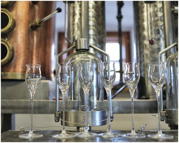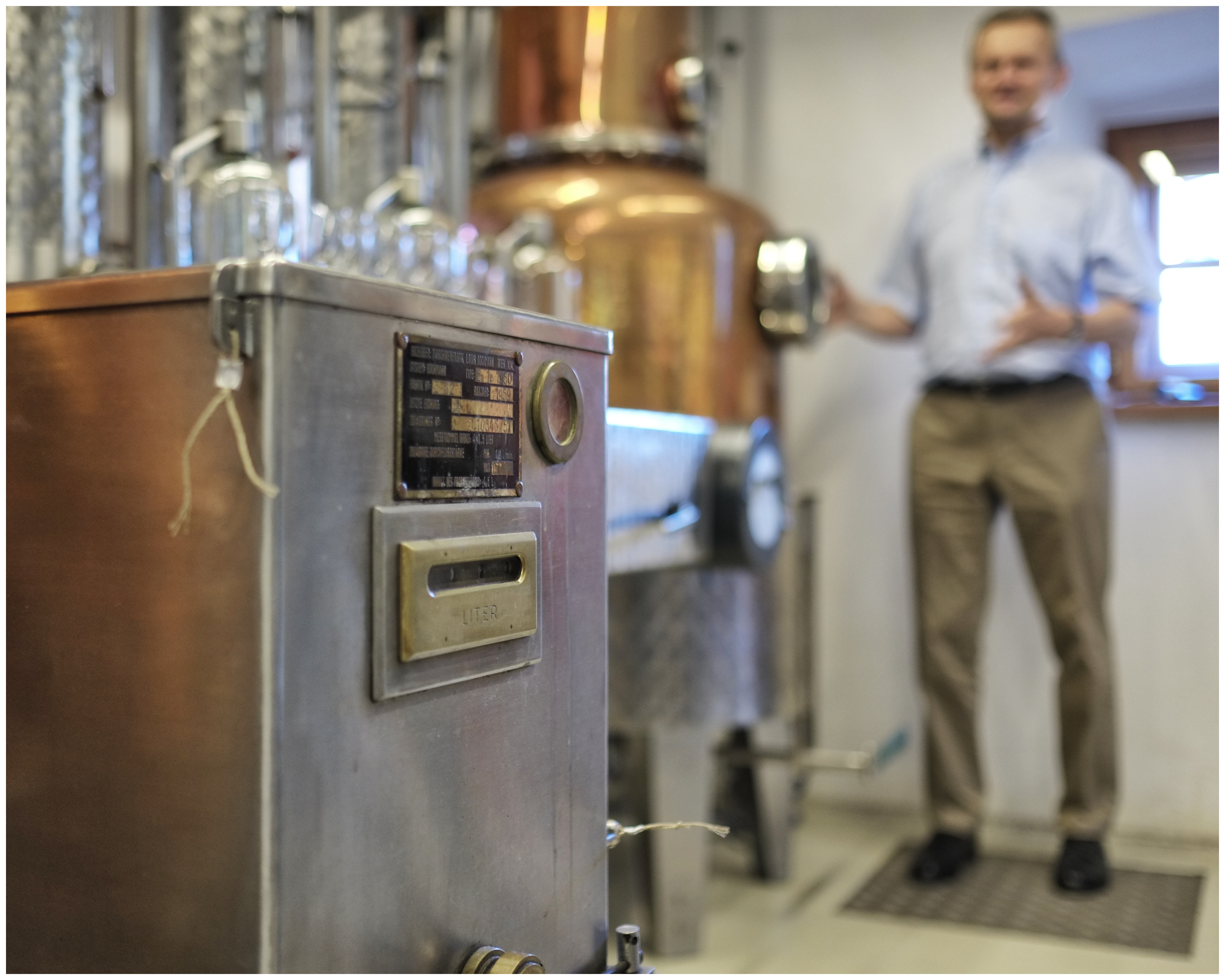 Doch zuvor führt Vogel durch die Produktion, Destilationsbirnen, Kühlschlangen und all die anderen Apparate in ihrer kupfernen Pracht sehen ja immer beeindruckend aus, der Rahmen der historischen Mauern bringt sie allerdings besonders gut zur Geltung. Und erst der Fasskeller! Uraltes Gemäuer behutsam saniert, der Sohn, praktischer Weise Architekt, hat es sogar zuwege gebracht, dem alten Stadel einen Keller unterzuschieben, in Eichenfässern von Chateau d´Yquem lagern aromatische Essenzen ihrer Trinkreife entgegen.