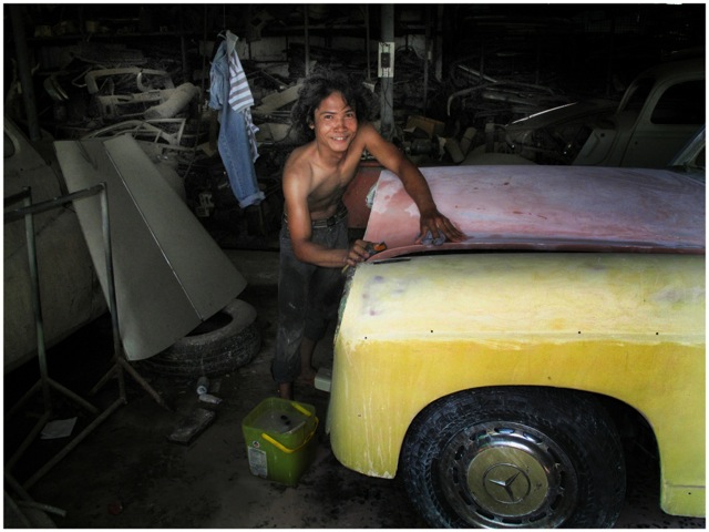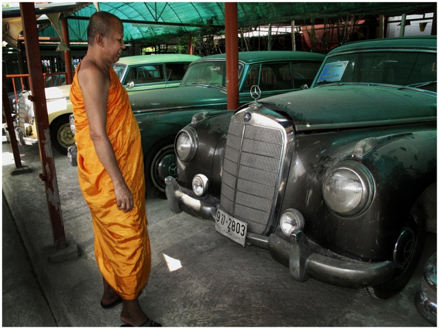 Oh du fröhliche schön und gut, aber leise rieselt der Schnee? Muss nicht sein, also ab in´s warme, Bangkok zum Beispiel. Dort friert man nicht und sieht trotzdem den obligaten Weihnachtsschmuck in den Malls. Und manch anderes, oft überraschendes. Etwa einen 1951er Adenauer Mercedes, den Vorgänger der S-Klasse, am Steuer ein junger Mönch, hinten ein älterer, beide kahl und orangefarben gewandet. Interessant, sind die nicht zu Armut verpflichtet?