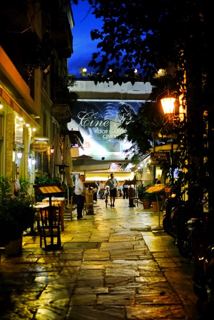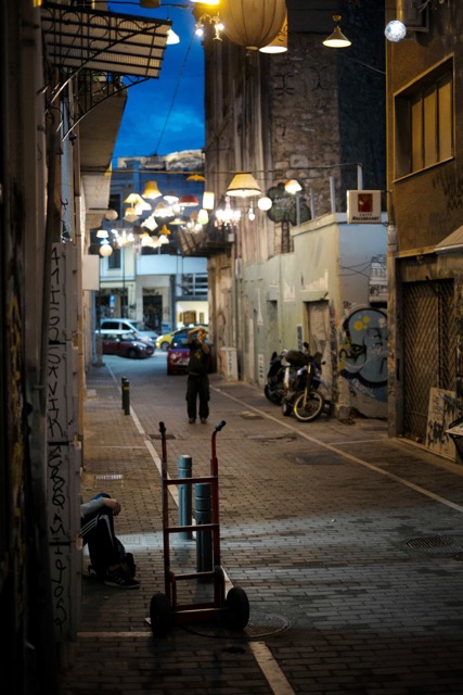 Aber auch so manche Künstler haben hier dank niedriger Mieten neben den alteingesessenen ihren Platz gefunden, eben auch in der Pittaki. Am eindrucksvollsten erlebt man die Metamorphose der dunklen Gasse in der Abenddämmerung, die Athener Stadtverwaltung lässt sich mit dem anknipsen der Strassenbeleuchtung reichlich Zeit, man will ja nicht von der EU-Toika wegen Stromverschwendung gescholten werden. Während jetzt im Winter der tiefblaue Himmel kaum noch Tageslicht in die Stadt wirft strahlen die weissen Tempel besonders schön, und dann: in der Pitaki gehen die Lichter an! Aber nicht banale Beleuchtungskörper, oh nein, unzählige Lampenschirme baumeln wie in Alice´s Wunderland über der Strasse und verzaubern die gerade noch düstere Stimmung in ein heimeliges Ambiente.