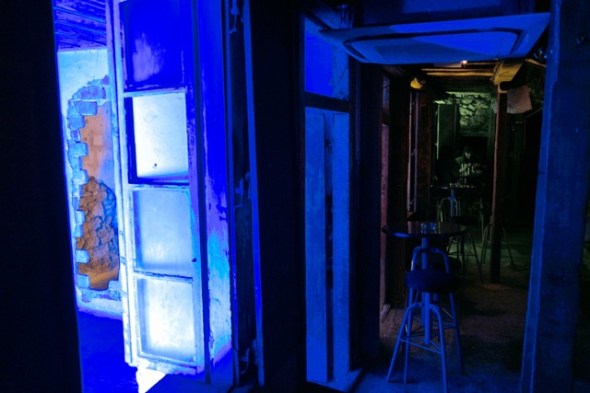 Nicht so schräg gegenüber in der Normannou Strasse in Monastiraki, jedenfalls wenn man dem ersten Eindruck nachgibt. Durch die leicht zu übersehende, viel zu niedrige Tür mit der Nummer 5 betritt man ein scheinbar kurz vor dem endgültigen Zerfall stehendes Gründerzeithaus. Viel wurde hier nicht verändert, die Schräge im Eingang deutet auf eine frühere Nutzung als Geschäftshaus, hier dürfte täglich reichlich Ware ein und aus gekarrt worden sein. Eine Treppe führt nach oben, das Hinweisschild sagt `Exhibition Space´, geradeaus geht´s in einen Innenhof, die Räume rundum sind farbig beleuchtet, jeder ein Ausstellungsraum für sich, in manchen der Installationen diskutieren Gäste und nippen an Gläschen. Eine Seite des Hofes nimmt eine moderne Bar ein, die Karte weist das Etablissement als T.A.F. aus, The Art Foundation. Sie ist eine quasi inoffizielle Aussenstelle der Kunstuni, selbstverwaltete Künstler Coop, Veranstaltungs- und Ausstellungsraum, vor Allem aber formloser Treffpunkt. Und eine formidable Bar mit anspruchsvoller Cocktailkarte, weswegen mich Panaiotis Papanicolaou hierher bestellt hat.