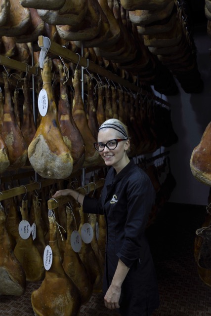 Nicht weniger überraschend als sein Umstieg von der Box in die Latteria ist der Anblick von Monica d´Oswaldo an ihrer Wirkungsstätte. Die zierliche junge Dame sieht auf den ersten Blick aus, als wäre sie auf dem Weg zum Photoshooting für ihr Plattencover, doch statt eines Gitarrenplektrons zieht Monica ein zugespitztes Stück Pferdeknochen aus der Tasche, ihr wichtigstes Werkzeug. Wozu sie das braucht? Sie bohrt es zärtlich aber doch entschlossen tief ins Fleisch einer der weit über Hundert Schweineschenkel, die im letzten Reiferaum ihrer Bestimmung als erstklassige Prosciuti entgegen hängen. Man glaubt ihr gerne, dass sie sich gar nicht vorstellen mag, was für süsse Ferkel am Beginn ihrer Arbeit standen, doch mit der gleichen Zuneigung, welche sie für diese zur Schau stellt, behandelt sie auch das langsam reifende Produkt ihrer Passion. Kein Wunder, dass der Grossteil der Prosciuti schon im voraus verkauft ist, an beinahe allen verrät ein Schildchen den wartenden Geniesser, diesmal liest man auch auffällig viele deutsche Namen, Sereinigg oder Ros zum Beispiel.
