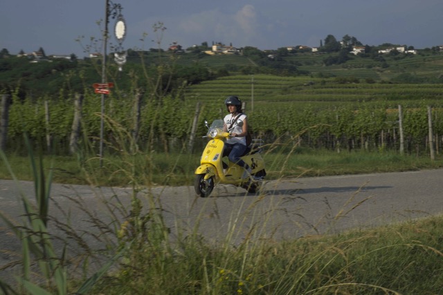 Mit den flinken gelben Vespas des Consorzio Vini geniesst man zwischen Collio und Brda ganz `slow´ natürliche grenzüberschreitende Gastfreundschaft, hundert Jahre nach der blutrünstigen Grande Guerra Prima