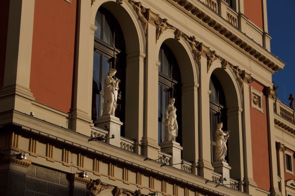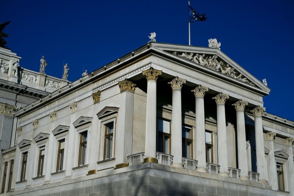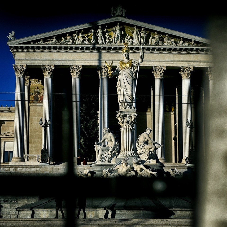 Die Wirkung der Sinas auf die Ringstraße ist allerdings weiterhin sichtbar, haben sie doch den jungen dänischen Architekten Theophil, ab 1884 Freiherr von, Hansen nach dem Studium in Athen nach Wien geholt, um hier Bauprojekte im „griechischen Stil“ umzusetzen. Was er denn dann auch gründlich tat, kaum ein Architekt hat das Bild der Ringstraße so sehr geprägt, wie Hansen. Vom Palais Erzherzog Wilhelm am Parkring, über den Heinrichshof am Opernring, das Ephrussi am Schottentor, die Akademie am Schillerplatz, die Börse, sein eigenes Palais Hansen bis zum Reichsratsgebäude, welches heute als Parlament bekannt und wohl eines der Lieblingsmotive tausender Touristen täglich ist. Ein Detail entgeht ihren Cameras dabei meist, nämlich jene vergoldeten Ornamente, welche an der nordöstlichen Ecke, gegenüber des Palais Epstein -Architekt, sie ahnen es, Hansen- in der Sonne glänzen. Hier durfte Hansen die Polychromie zeigen, die er sich vorstellte, das Baukomitee sah und siegte, unter Verweis auf Budgetnöte blieb es beim Beispiel. Anscheinend unsichtbar bleibt hingegen eine Innovation Hansens, welche das ganze Gebäude bestimmt: erstmals wurde hier nicht der am Bau damals, nicht nur in Österreich noch übliche, Klafter als Maßeinheit verwendet, sondern der unerhört moderne Meter angewandt!