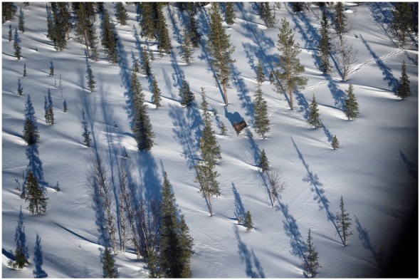 Auch den Elchen gefällt, dem Vernehmen nach, solch wohlig warmes Wetter, zumal die Bullen bei der Brunft im Herbst erheblich an Gewicht verlieren, und so Gefahr laufen, während der Wintermonate zu verhungern, da sieht man wieder, wie sehr der Geschlechtstrieb den Männern zusetzen kann. Als Konzentratselektierer sind die der Unterart der Trughirsche zugehörigen Wiederkäzer auf Energiereiche Nahrung angewiesen, die in Form von jungen Trieben nun wieder an die Luft trauen. Und weil Alces alces der einzige Hirsch ist, welcher auch unter Wasser äsen kann, wo seine Natriumhaltige Lieblingsnahrung prächtig gedeiht, freut er sich schon besonders auf die ersten freien Tümpel. Bis es soweit ist wird´s aber, wie wir gehört haben, noch ein Bisserl dauern, bis dahin durchstreift er sein ihm bekanntes Teritorium, im Winter bescheidet er sich mit 200 Hektar, weitet es im Sommer auf bis zu 1500 aus, die er trotz der Grösse eher einzelgängerisch begrast. Diese raumgreifende, misantropische Lebensweise dürfte auch der Grund dafür sein, dass wir, selbst beim Patroullieren auf dem Motorschlitten, nicht einen einzigen dieser riesigen Paarhufer getroffen haben, auch den meisten Einheimischen ist er nur von unerfreulichen Wildunfällen auf der Landstrasse persönlich bekannt.