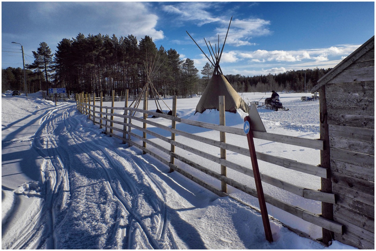 Mittagspause machen wir an einem kleinen See, natürlich fest zugefrohren, so bleibt das hier mindestens noch bis Juni. Na ja, heuer vielleicht nicht, unsere Führerin bleibt beim Versuch, mir für ein Photo eine dynamisch hingelegte Kurve vor die Kamera zu legen fast stecken, „komisch, so schwer ist der Schnee um diese Jahreszeit für gewöhnlich nicht“, wenigstens müssen wir sie nicht ausbuddeln. In einem hölzernen Tipi brennt schon das Feuer, an dem wir Renntierwürstel und geräucherte Filets grillen und verzehren werden, das heisst, verzehren tu ich sie lieber draussen. Erstens ist die Luft da besser, der Ausblick sowieso, und in der Sonne lässt sich´s echt gut aushalten, frühligshaft geradezu. Sollte es Anfang März eigentlich nicht, ich weiss, aber mir soll´s Recht sein, mir ist Frühlingsschilauf auch lieber, als das elende Frieren zu Weihnachten, und hier und jetzt spielt es gerade genau meine Lieblingsversion von einem Winter!