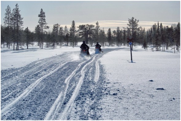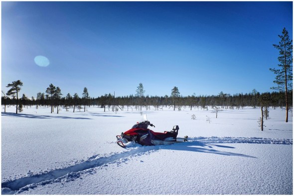 Und während die Langläufer klassisch oder im Schlittschuhschritt geräuschlos in die schier endlosen Weiten Lapplands ziehen drücken wir faul den Gashebel und sind blitzartig im ersten schütteren Birkenwäldchen verschwunden. Und auch schon wieder draussen, meist verläuft die Strecke über weite Ebenen, im Sommer sind sie Sümpfe erklärt Mika, weswegen er auf ihnen auch nicht seiner sommerlichen Motorsportalternative auf der Enduro fröhnen kann. Aber gute sechs Monate lang darf man sich dafür auf dem Motorschlitten austoben, so dünn besiedelt, wie das Land hier ist, beschwert sich keiner über die Wilden auf ihren Maschinen.