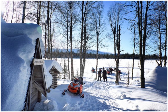 Ziemlich gefinkelt haben sie hier die Verkehrsführung ausgetüftelt, eine Unterführung vermeidet die Konfrontation mit Radfahrzeugen oben auf der Hauptstrasse, feinsäuberlich getrennt gleiten Langläufer, stolpern Wanderer, tuckern wir Schneemobilisten aus der streng reglementierten Zivilisation hinüber in die kleine Freiheit. Platz ist da ja genug, die den diversen Interessen gewidmeten Wege nehmen Abstand zu einander, links biegen Männer mit grotesk kurzen Angelruten zum dick zugefrohrenen See ab, sie werden noch Stunden später bei unserer Rückkehr regungslos auf dem Eis hocken und ihre Ruten über die, mit professionellem Gerät gebohrten Löcher halten.
