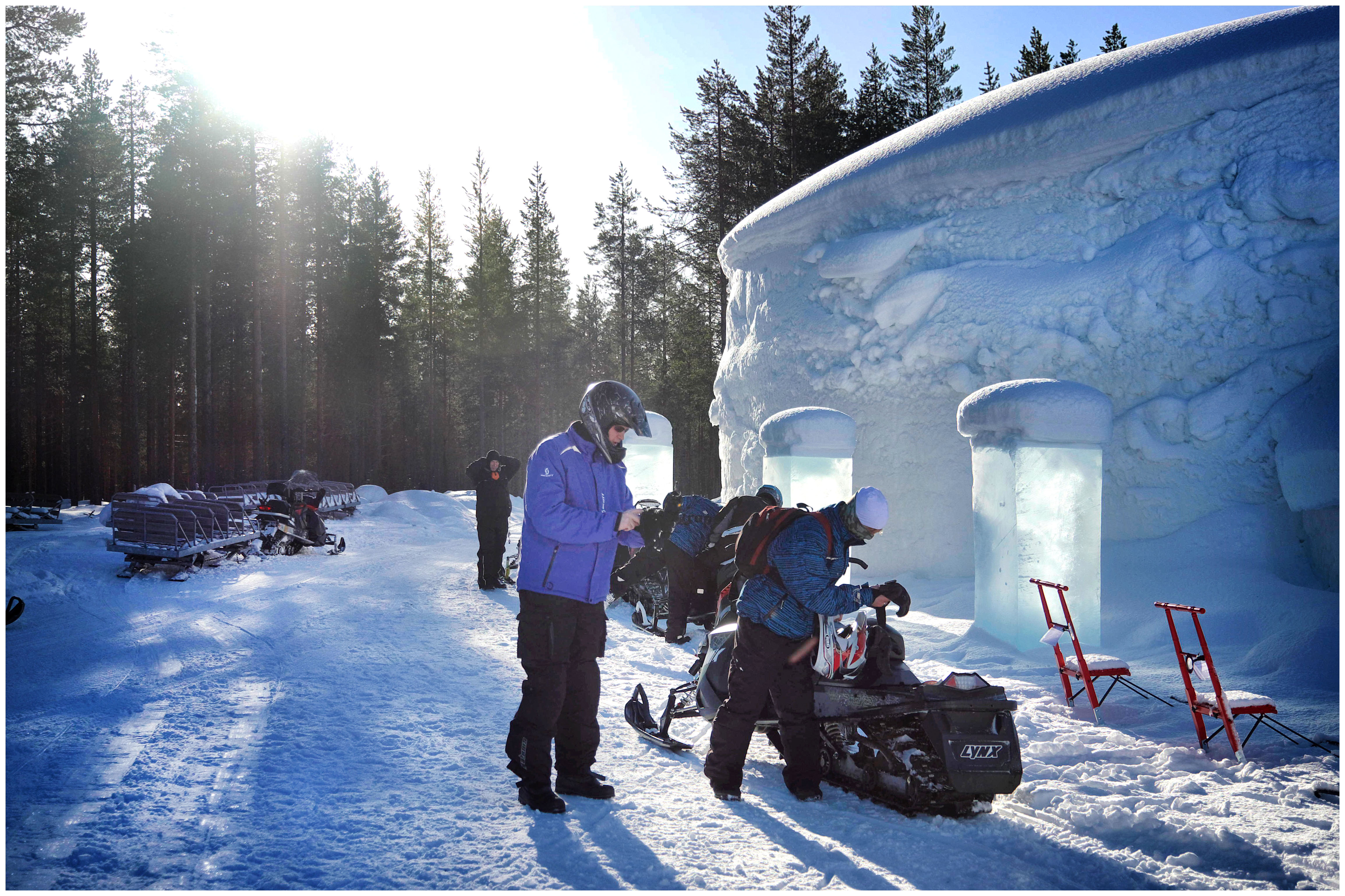 Was macht der Finne, wenn ihm zu wohlig wird? Er legt sich auf´s Eis schlafen! O.k., war eine freie Assoziation, aber anders lässt sich ein Hotel wie das Laino Snow Village in Lainiotie eigentlich nicht begreifen. Klar, schaut toll aus, ist -fast- einzigartig, und irgendwie auch logisch, hier oben jenseits des Polarkreises. Alljährlich wird es neu errichtet, aus 20 Millionen Kilo Schnee und 350 Tonnen klaren Eises, auf 20.000 Quadratmetern entstehen dann 27 Zimmer und Suiten, Bar und Restaurant, und, jawoll, eine Hochzeitskapelle! Die schaut auch wirklich, wie alle Räume hier, Bänke und Altar aus kristallklar Gefrorenem unter dem mattweissen Schneegewölbe mit, ähh, byzantinischen Dekorelementen. Die Zeremonie lässt sich so sicher aushalten, der Vodka bleibt schön kalt, wird er doch in Eisstamperln gereicht. Aber danach? Angeblich sind Hochzeitsnächte für beinahe 30 Prozent der Auslastung verantwortlich! Man tut da dann das was in so einer Nacht zu tun ist zwar auf kommoden Luftmatratzen, aber sonst ist alles im Zimmer -sie ahnen es- aus eiskaltem Baumaterial errichtet, inclusive Bettstatt. Da darf man sich nicht gehen lassen, wer die Spielwiese auch nur kurz verlässt, und sei´s auch nur mit einem Arm, wird wohl umgehend von jeder extatischen Tätigkeit absehen. Und der Weg zu den Sanitäranlagen ist auch kein leichter, zudem öffentlich erfordert also Bekleidung anzulegen, was auch nicht so leicht fällt, wenn man mit den Schuhen beginnen muss, damit die Fusssohlen nicht am Boden festfrieren. Egal, jeder wie er ma, ich habe aber einen Gast getroffen, der nächtens nicht mehr vom Lokus in seinen Igloo fand, schaut auch wirklich alles sehr ähnlich aus hier. Er hat´s dann auch gar nicht mehr lange versucht, ist wieder zurück ins Bad, weil: das ist nämlich beheizt! Weswegen er auch nicht der Einzige war, der dort erwachte, als die ersten Unentwegten tiefgekühlt mit ihrer Zahnbürste antanzten.