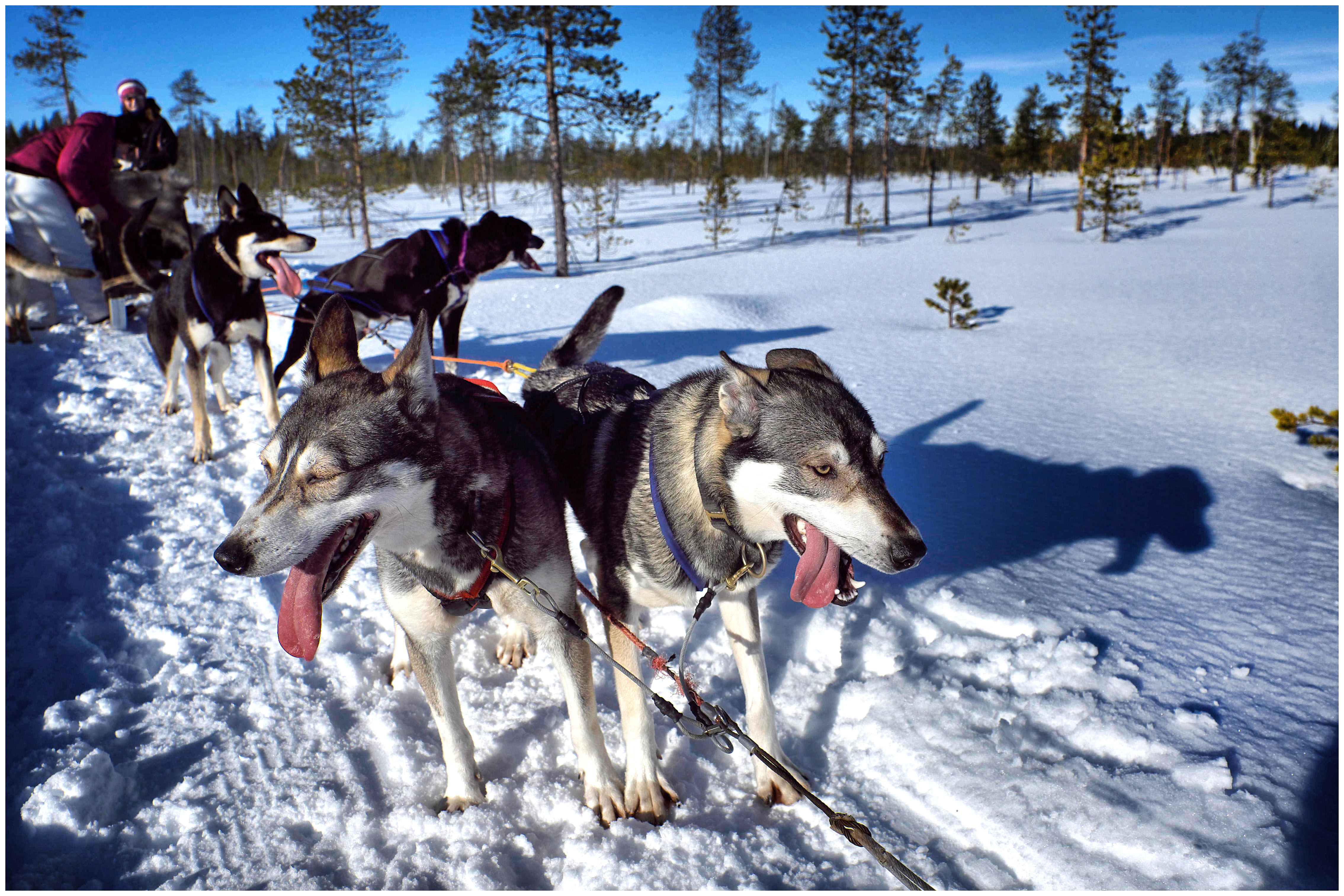 Als Pauliina dann tatsächlich von der Bremse steigt und ihr Gespann von der Farm in die Wildnis dirigiert kann auch ich endlich von dem kleinen Stahlblechrechen steigen, der als Bremse dient, und Shakkira legt los. So heisst meine Leithündin, neben ihr läuft ihr Sohn Shumi, insgesamt müssen mich und meine Passagierin sechs von den kleinen Kraftpaketen schleppen, der Schlussmann hört immerhin auf den Namen Apollon. Wegen der grossen Hitze, zu Mittag sind es deutliche Plus eins bis zwei Grad, hängen die Zungen der Armen Zugtiere meist bis zum Boden, die Sibirer schnappen dauernd neben die der Spur in den Schnee, um sich zu kühlen, den Alaskaern geht es ein wenig besser -oder war´s umgekehrt-, noch weniger zu schaffen machen die geradezu tropischen Temperaturen den Mischlingen, Pauliina hat den einen oder anderen Kurzhaarigen eingekreuzt. Die schauen nicht ganz so toll aus, aber funktionieren ab etwa Minus 10 deutlich besser, „letztes Jahr waren die Meisterschaften in Deutschland, da haben viele ihre besten Hunde rasiert, das sieht dann wirklich komisch aus“, plaudert sie aus der Schule.