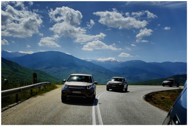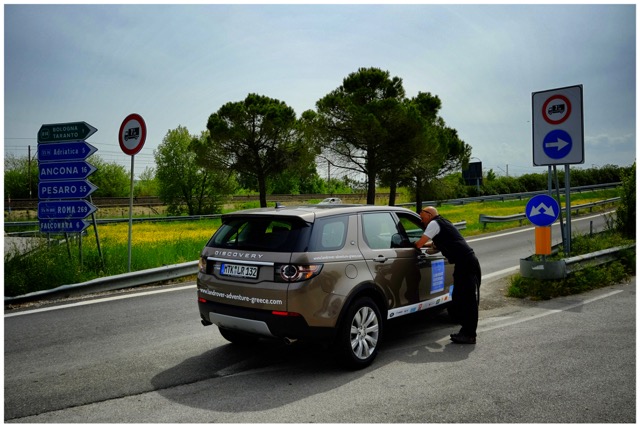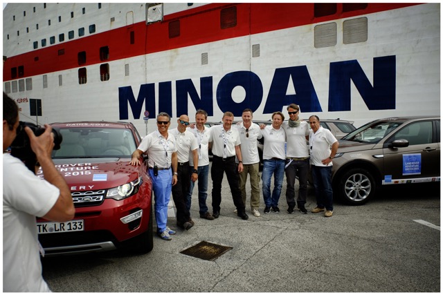Seit Freitag sind die fünf silbergrauen und der eine rote Wagen unterwegs, vom Main ans Mittelmeer, gesteuert von Enthusiasten aus der Reisebranche unter professioneller Aufsicht zweier Guides von Land Rover Experience. Ich durfte der Gang kurz vor der Einschiffung am Flughafen von Ancona beitreten, der Auftritt war schon recht imposant, ich glaube, dort wurde noch nie ein Journalist von einer derartigen Armada in Discover Greece Livreé abgeholt.