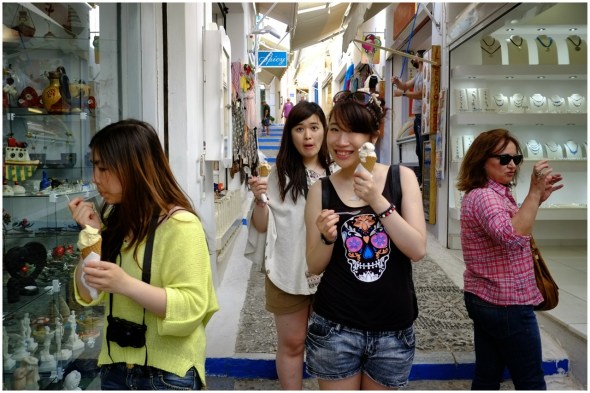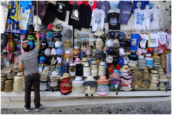 Die Wirtschaft der Stadt Thira scheint einzig und allein auf der intensiven Nutzung der melkbereiten Touristen zu beruhen, allerorten wird wertloser Tand feilgeboten, aber nicht nur, wir sind ja immerhin in Griechenland, und da hat man sich, nicht zu letzt nach den Erfahrungen in der sogenannten Krise, auf Traditionen und Werte besonnen. In Land- und Gastwirtschaft macht sich das überall bemerkbar, hier und jetzt auch in den Souvenirläden. Leicht zu übersehen zwischen all den Kitschbuden in seiner schlichten Eleganz wartet „Deli Art“ auf Kunden, welche Souvenirs suchen, die genau diese echte, auf Tradition und Qualität bedachte Seite des Landes lieben. Hier findet man ein breites Angebot greichischer Delikatessen, vom Öl aus allen Regionen über Mastiha Produkte bis zu Honig und feinen Konserven aus ganz Griechenland.