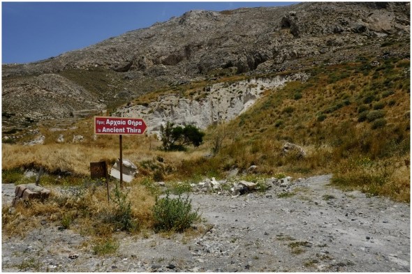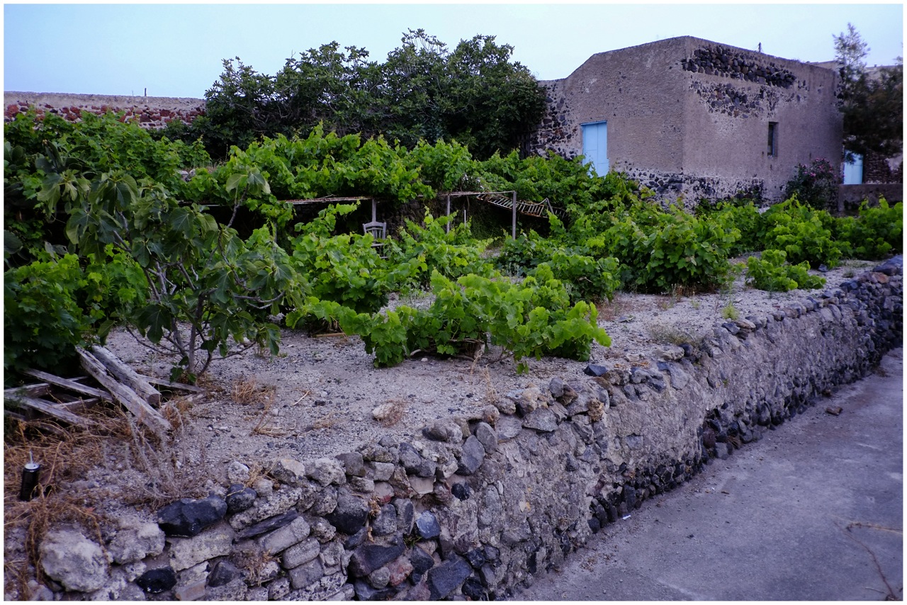 Vom Hafen, der wie ein Treppenabsatz über dem scheinbar endlos tiefen, dunklen Meer innen in den Vulkan gemauert wurde führen ettliche Serpentinen steil hoch bis man unvermittelt am Ortsrand von Megalochori in einenKreisverkehr und die schräge Hochebene kippt. Statt schroffen schwarzen Felsen bestimmt üppiges Grün das Bild, zumindest im Frühsommer, abgesehen von Häusern und Gehöften scheint´s hier nur Wein zu geben, nichts als Reben, niedrig zwar und die Reihen nicht so dicht geschlossen wie sonst wo, aber Durst wird man hier nicht leiden müssen.