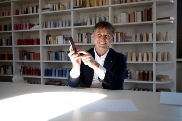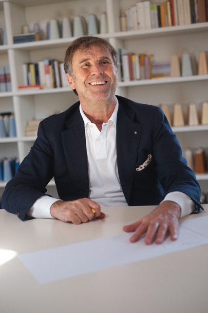Aus dem Fenster in der Wand, an der Bilder von Cucinellis Lieblingsdenkern hängen sieht man hinunter auf die Baustelle des neuen Stadions, welches er für den lokalen Sportclub errichten lässt. Die Tribünen sehen, obwohl noch nicht ganz fertiggestellt, aus, wie aus alten Zeiten, das Dach wird von massiven Holzbalken getragen. Genau wie jenes im Teatro Cucinelli auf der anderen Seite des Dorfes, welches ganz in antiker Tradition errichtet ist, wo Alabasterbüsten bedeutender Philosophen über das Auditorium wachen. Direkt vor dem Fenster hinter Cucinelli zeigt die Kirchturmuhr die Zeit.