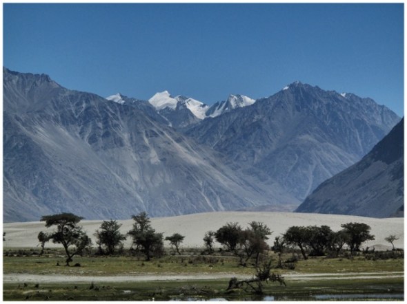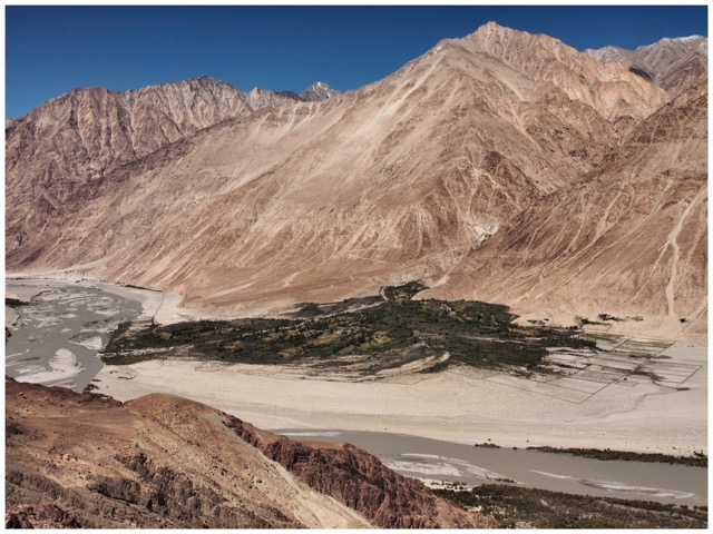 Die Hälfte des Jahres liegen die Temperaturen hier, am tiefsten Punkt Ladakhs, unter Null, der wenige Niederschlag fällt als Schnee vom meist tiefblauen Himmel, dementsprechend wüst sieht das Land aus. Die -noch- reichlichen Schneereservoirs oben in den Bergen schmelzen langsam dahin, bilden klare Flüsse, die kunstvoll umgeleitet üppige Bergoasen befruchten. Um sich schliesslich im heiligen Fluss Indus zum Subkontinent nach Pakistan zu verabschieden.