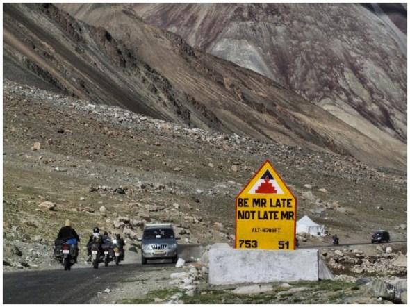 Der Rest des Landes ist über einige wenige Militärstrassen zu erreichen, fast alle führen über schwindelerregende Pässe. Die werden von BRO, der Border Road Organisation der Indischen Armee in Schuss und möglichst schneefrei gehalten. Daß dies nicht ganz einfach ist zeigen unzählige zerknüllte Caterpillar die unten in der Talsohle die Fehler ihrer Chauffeure abbüssen. Um Nachahmungstäter zu warnen zieren alle paar Kilometer grellgelbe Warnsteine die Bankette, „if married, divorce speed“ liest man, „drive slower, live longer“, „you are not being chased“, oder „BRO men cut the hills but join hearts“ als Tribut an die Erbauer.