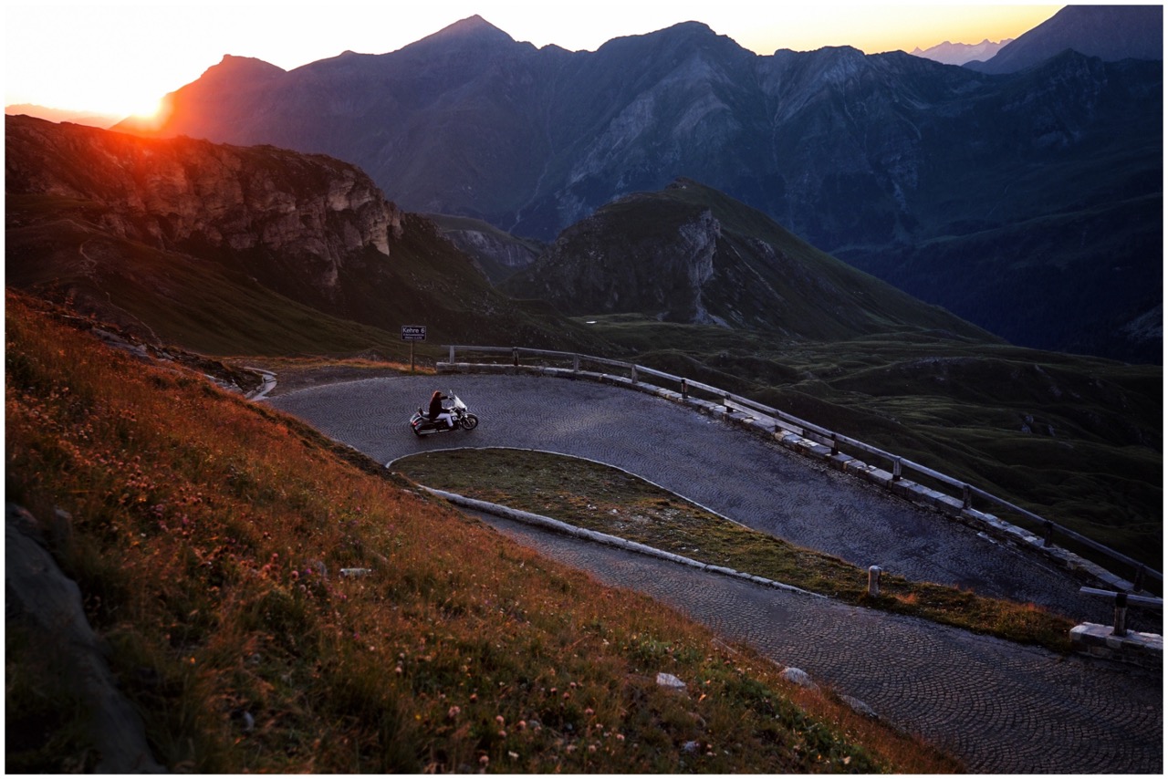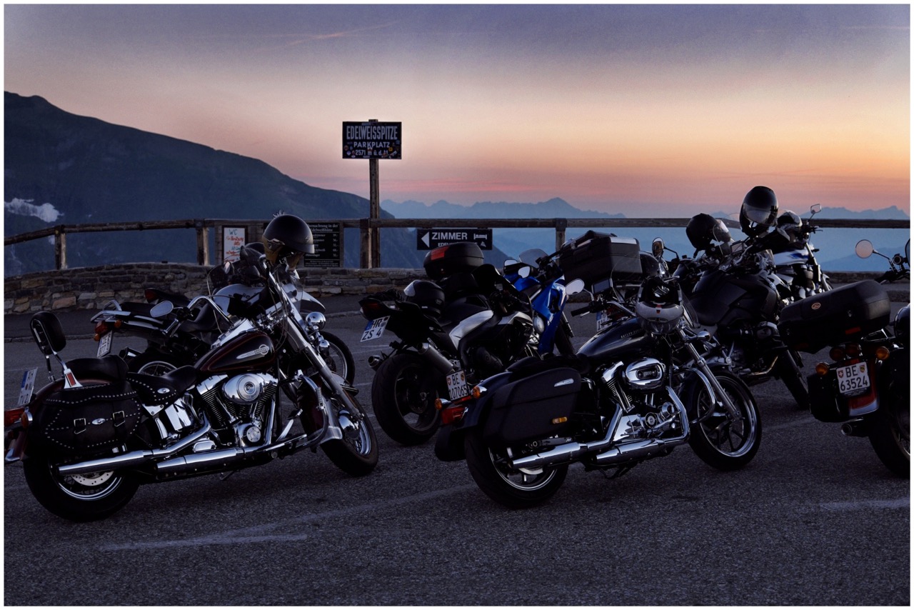 Und das war eine Moto Guzzi, Grund genug die neue California zu satteln, und die Edelweisspitze zu erklimmen. Und zwar abends, wenn die Touristenmassen längst wieder zu Tal strömen, nur der penetrante Odeur von geschundenen Bremsbelägen zeugt noch von ihrem Besuch.