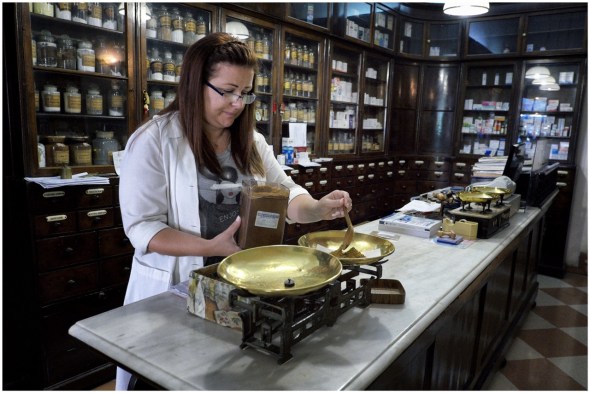Bei Vasliki, wohlgemerkt, traditionell kauft man seine Gewürzmischungen nämlich in der Apotheke, die Menschen auf Korfu sind fest davon überzeugt, man mache das überall so. Als erste Adresse gilt immer noch die Farmakeio Karmela Deleonardou, Magistra Alegri schlägt stolz ein abgegriffenes Buch auf und verweist anhand alter Stiche auf den seit 1850 nachweisbaren Familienbesitz. Und beinahe täglich werden ihre Spetserika nachgefragt, sie bestätigt auch die Angaben Vassilikis, über die genau Dosierung schweigt sie ebenso, wie über die genaue Anzahl der Ingredentien, doch mindestens Fünfzehn müssten es schon sein. Und dass sie als Apothekerin dafür zuständig sei liege auf der Hand, die Wechselwirkung der unterschiedliche Phenole müsse man nämlich kennen, schliesslich seien die meisten Gewürze ja eigentlich Heilpflanzen. Was natürlich nicht erst die Venezianer entdeckt hatten, schon Hipokrates und Galen erkannten den Einfluss der Ernährung auf die Gesundheit, auch die Alegris sehen ihre Aufgabe als Pharmazeuten eher in der vorbeugenden Gesundheitsvorsorge denn im Behandeln. Wenn das dann auch noch kulinarische Freuden mit sich bringt, umso besser, bewusst entspannter Genuss scheint ja ohnedies eines der Geheimnisse der Mittelmeerdiät zu sein.