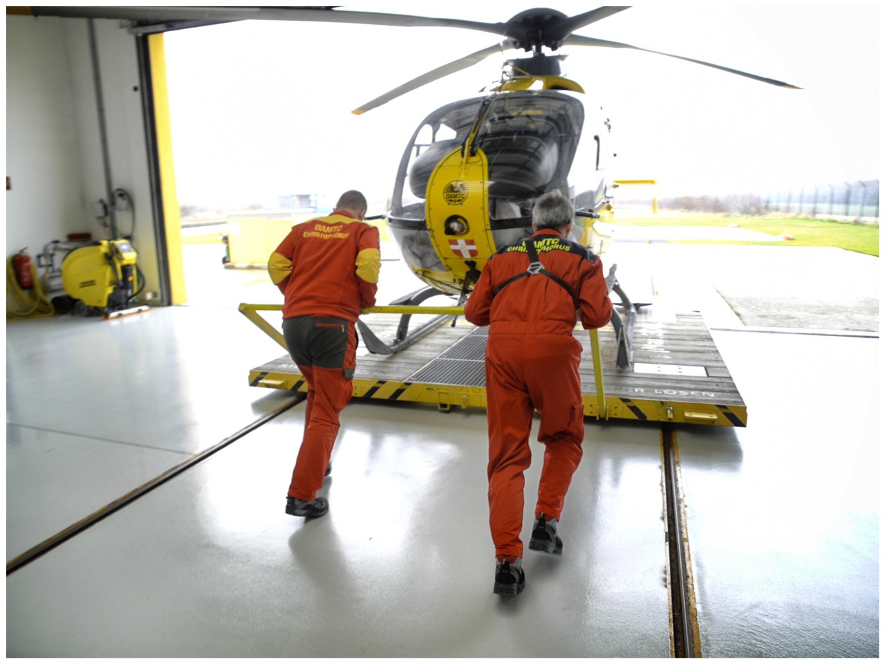 In der klinisch sauberen, hell erleuchteten Halle wartet der Hubschrauber auf seinen Einsatz, geparkt ist er auf einer Holzplattform, die sich auf Schienen hinausrollen lässt. Noch sind so ziemlich alle Türen, Luken und Klappen geöffnet, orangefarbene Rucksäcke, geöffnet und übersichtlich ausgebreitet liegen davor.