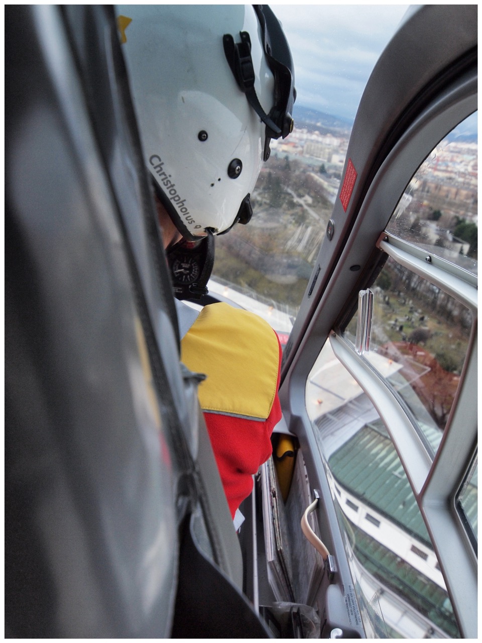 Landung auf dem Dach des UKH, von oben sieht es aus, wie ein Flugplatz, die Pfleger, welche auf die Übernahme warten kennen das Procedere eindeutig ganz genau, alles läuft wie am Schnürchen. Kaum, dass Dr. Polz mit ihnen im Lift verschwindet, die nächste Anforderung: „Wien 17, Charturitzkigasse, Verdacht auf Herzversagen!“ Man kann unser nächstes Ziel gut erkennen, voraussichtliche Flugzeit: 2 Minuten, keine Masten, keine Stromleitungen. Der Rotor läuft schon auf Einsatzdrehzahl, als Polz in den Helicopter springt, wir heben ab wie ein Expressfahrstuhl, nur dass wir uns gleichzeitig um 180 Grad in Zielrichtung drehen. Keine zehn Sekunden später meldet eine der krächzenden Stimmen aus dem Äther etwas mir unverständliches, gleichzeitig bemächtigen sich G-Kräfte aus allerlei Richtungen meiner Gleichgewichtsorgane, Planänderungen werden im Helicopter in Real-Time in Richtungsänderungen umgesetzt, und aus dem Seitenfenster habe ich grossartige Aussicht auf den Westbahnhof. „Einsatz storniert!“, warum wird nicht weiter hinterfragt. „Fehlalarm, bereits erfolgte Versorgung, oder nicht mehr notwendige ist für uns kein Thema, wir kommen wenn man uns ruft, und helfen, wenn wir können!“