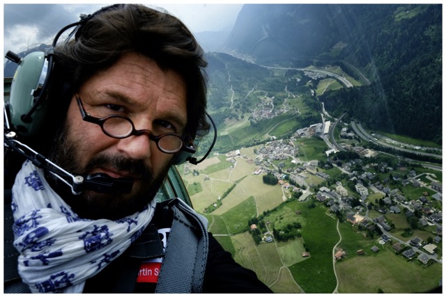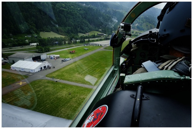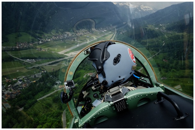 In der Tat, die 650 PS reichen, um das Fluggerät mit dem Gewicht eines Kleinwagens vehement vom Boden zu reissen, die anschliessende scharfe Rechtskurve lässt meine Hand mit der Kamera hart gegen den Sitz knallen. Während ich Halt suche schliessen unsere beiden `Wingman´ auf, wir fliegen ein paar Manöver über dem Tal, kippen ab, schiessen auf den Flughafen hinunter, der gemeinsame Überflug in enger zehn Metern über den Köpfen der Zuschauern muss von unten spektakulär aussehen. Den Meldungen in den Kopfhöhrern entnehme ich, dass wir die Formation auflösen, jeder sich ein Übungsgebiet aussucht, wir nehmen den Gotthard, nettes Sightseeing, bis zur entscheidenden Frage: Ob ich bereit sei für ein paar Manöver? Merci vielmals, mal sehen was geht, bei 4 G meist nichts mehr, wenn mir schwarz wird vor den Augen soll ich´s sagen – wenn ich noch kann.