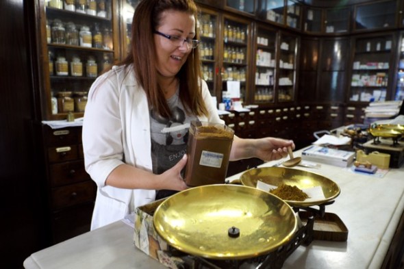 Magistra Alegri Deleonardou mixt ihre Gewürzmischungen nach geheimen historischen Rezepten in ihrer Apotheke, man findet das hier ganz normal. Auf Kasse gibt´s die Spetserika allerdings nicht.