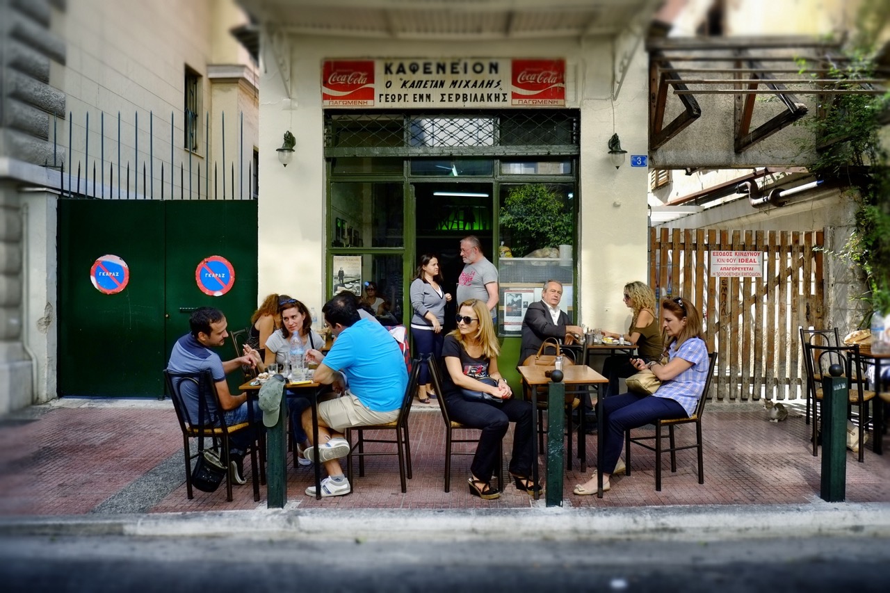 Das Datum wird jährlich gewürdigt, teils feierlich, teils aktionistisch-revolutionär. Exarchia, die Gegend hinter der Uni, ist immer noch studentisch dominiert, die Analogie zur Anarchia wird geradezu folkloristisch gelebt. Und als anlässlich der gegen Griechenland verhängten Austeritätspolitik Fernsehsender aus aller Welt spektakuläre Bilder benötigte, besann man sich alter Seilschaften, rasch brannten Mülleimer und Bankfassaden, die gewünschten Negativschlagzeilen waren geliefert. Schlendert man allerdings unvoreingenommen durch die engen Gassen unterhalb des Strefi Hügels bietet sich ein überraschend anderes Bild. Hinter von bunten Graffitis geschmückten Mauern lauern hauptsächlich kleine Boutiquen, Kunstgewerbeshops, Galerien, Bars und Tavernen. Angst muss man nur davor haben, bis in die frühen Morgenstunden wegen dem Vergnügen und Genuss zum Opfer zu fallen. Tritt man dann beispielsweise Samstag früh hinaus ins grelle Tageslicht kommt man gar nicht umhin, lautem Geschrei auf den Grund zu gehen. Reife Tomaten und frischen Fisch wird angepriesen, am Laiko, der Wochenmarkt auf der Kallidrommiou Straße und Athen zeigt sich charmant dörflich.