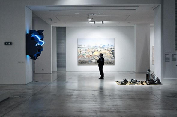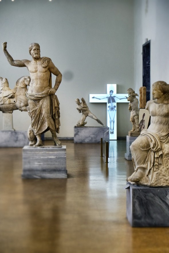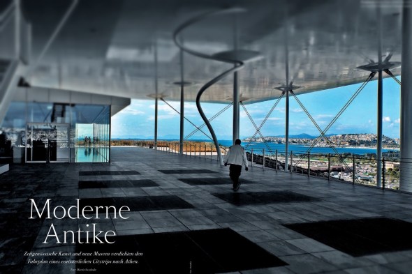 Auch das Dach wird wieder bespielt, schon letzten Sommer war es der Platz, an dem man sich dem Kunstgenuss hingeben musste, im Sonnenuntergang, die Akropolis unmittelbar vor der Nase abgehoben zwischen zwei der hektischsten Verkehrsarterien der Stadt kann man sich der Faszination kann man sich dem überwältigendem Panorama hingeben, alle Klassiker sieht man von hier ganz deutlich, versteht, warum genau hier einst der Nabel der Welt lag. Von drei einst bewaldeten Gebirgszügen geschützt gegen Einfälle vom Land, offen zum Meer an der vierten Seite mit der festungsartigen Halbinsel von Piräus als Brückenkopf. Entlang des Syngrou Boulevards, den man von hier hinunterblickt, ist in den letzten Jahren eine veritable Museumsmeile entstanden. Neben dem EMST sind es vor Allem das STEGI im Onassis Center und das gerade erst fertiggestellte SNFCC, die Athen zum „must“ für Kunstinteressierte machen. Letzteres Akronym steht für Stavros Niarchos Foundation Cultural Center, es wird neben der Nationalbibliothek auch die Griechische Staatsoper beherbergen, das von Renzo Piano entworfene Gebäude ist nicht nur schon von weitem unübersehbar, es bringt die Stadt auch erstmals seit Ewigkeiten wieder direkt ans Meer.