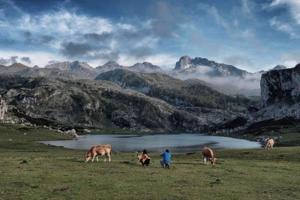 Auf halber Strecke künden riesige Parkplätze im engen Tal vom Wallfahrtsort Cuadonga, je genau, dort haben wir Christenmenschen vor 1300 Jahren erstmals die Westeiberienroute blockiert und wenigstens Nordspanien mal den Ungläubigen entrissen. Grund genug für Pabst Juan Pablo 2o dortselbst im August 1989 der heiligsten Jungfrau zu danken, sein Landsmann Przemislav Niemec stattete seinen Dank 2014 vierzehn Kilometer weiter oben ab. Dort liegt nämlich auf über eintausendeinhundert Metern über dem Meer bei den Covadonga Seen regelmäßig die Ziellinie der Vuelta, auch heuer werden sie wieder Anfang September raufstrampeln und die alpine Kühle genießen. Genau wie die Kühe, das elegante Grauvieh wartet genüsslich vor dem malerischen See, in dem sich die stets schneebedeckten Gipfel spiegeln, widerkäuend auf die Sennerin, Idylle pur!
