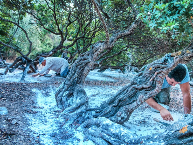 Wundern tut sich hier keiner über neugirige Fremde, die dem unergründlichen Wunder von Chios auf den Grund gehen wollen. Der Mastixstrauch, biologisch Pistacia lentiscus, wächst zwar auch anderswo, doch nur auf auf Chios lässt er sich melken. Unter den baldachinförmigen Büschen die durch jahrzehntelange Kultivierung Bäumen ähneln macht sich ein älterer Herr zu schaffen. „Mein Vater“, stellt Nikos vor, „er lebt den Rest des Jahres in einer Eigentumswohnung in Athen und könnte sich´s gut gehen lassen- aber ihm scheint´s Spaß zu machen!“ Behende klettert der Herr Papa zwischen den Ästen umher, rutscht auf den Knien in die hintersten Winkel, klaubt weisse Klumpen von der Erde. Die ist auch weiss, mit Kalk bestreut, das Mastihaharz glitzert als gläserne Tränen in der Morgensonne, wenn es einige Tage an der frischen Luft liegt wird es zu einer flachen, milchig weissen `Pita´