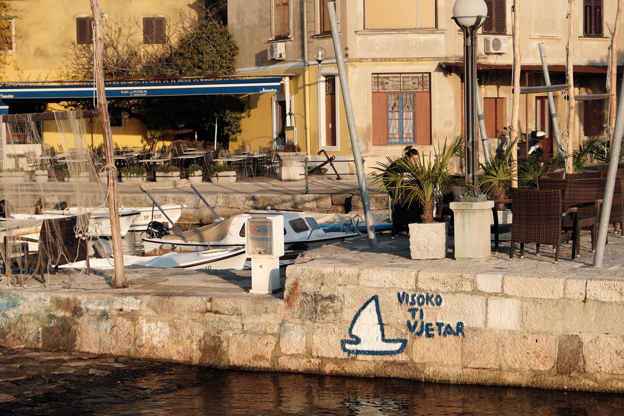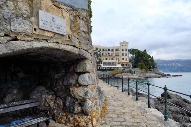 Wobei: so eine Entführung lässt man sich gerne gefallen! Und versteht sogleich, warum der Kaiser seine Kati Schratt hier gerne getroffen hat, Sisi ihren Andrássy und Gräfin Henkel Donnersmark die von einem Burgenländer als Urlaubsdomizil errichtete Villa Meyne erstand und nach dem Vorbild des Schloss Miramar in Triest romantisch umgestalten liess. Ein beheiztes Schwimmbad, so wie heute, hatte sie noch nicht, eine standesgemässe Bootsanlegestelle hingegen schon, konnte aber auch auf dem zu jener Zeit angelegten Lungomare zu den auf Empfehlung von Univ. Prof. Theodor Billroth eingerichteten Sanatorien entlang der Küste lustwandeln. Ein auch heute noch durchaus empfehlenswerter Zeitvertreib, während sich die Lungen ander frischen Luft laben ergötzen sich die Augen an stetig wechselnden Bildern von Wellen, Wolken, den Gipfeln von Velebit, Učka und der Insel Cres. Am Horizont gleiten Frachtschiffe und Tanker dem Hafen von Rijeka zu St. Veit am Flaum heisst heute so, falls sie sich weiter oben gefragt haben), einige der kleineren Fischerboote steuern offensichtlich Orte weiter nördlichen oder südlich Opatijas an. Grund genug ausgedehntere Spaziergänge dorthin zu wagen.