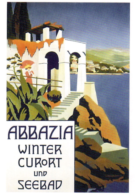 Doch damals, in der zumindest für eine elitäre Oberschicht, guten alten Zeit suchte man Sommers eher Frische, etwa in Ischl oder am Semmering. Um dort hin zu gelangen bediente man sich der neuesten high-tec-Errungenschaft: der Eisenbahn! Baron Sina hatte, die Trasse seines Kanals nutzend den ersten Schritt getan, die Rothschilds das Kapital für den weiteren Ausbau, das Kaiserhaus stets das strategische Interesse an flottem Transport und übernahm das Unternehmen ergo bald in Staatsbesitz. Vor Allem die Anbindung an die Häfen von Triest, St. Veit am Flaum und natürlich Pula lag ihm am Herzen, also wurde eine Südbahngesellschaft gegründet, der Bau vorangetrieben, die Baulose vergeben. Spätestens angesichts der funkelnden Adria war den Hohen Herren vor Ort allerdings rasch klar, dass man die Schienen nicht nur für Armee und Marine legen sollte, nahm sich ein Beispiel an Igenio Scarpa und begann rund um dessen Villa Angiolina neben der Abtei des Hl. Jakob einen prachtvollen Kurort zu errichten.
