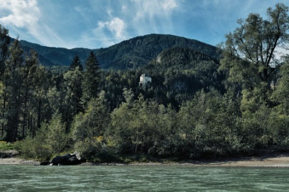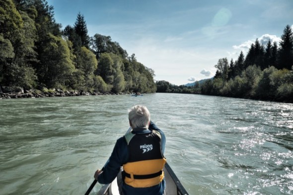 Der Drau unten im Tal macht das Licht gar nichts, im Gegenteil, funkelnd durch Felder und Auwälder fließend lockt sie mit stetiger Strömung. Beim Bahnhof Oberdrauburg wartet schon Steffen neben zwei Kanadiern darauf uns in Schwimmwesten gewandet in die Geheimisse des Flusswanderns einzuführen. Derer gibt´s nicht allzu viele, der Hintermann steuert, vorne wird angetrieben, die Hauptarbeit erledigt der Fluss, für sechs Kilometer in der Stunde Durchschnittsgeschwindigkeit sorgt allein die Drau. Da kann man genüsslich die Landschaft betrachten, der Orsinis Burg Stein studieren, von der aus sie ihre 4000 Hektar Jagd an den Hängen des Jauken kontrollieren. Ein herrlich kontemplatives Erlebnis aus dem einen erst das Kommando zum landen reißt, auch das geht locker auf einem der Sandstrände von Statten.