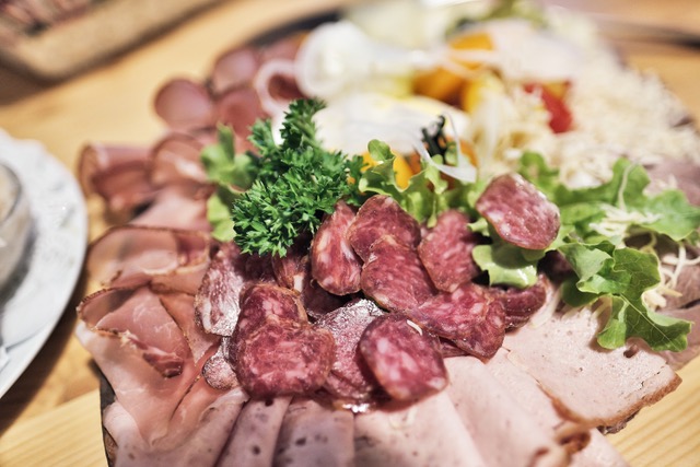 „Wir haben natürlich lange mit verschiedenen, vornehmlich frühreifen, Sorten herumprobiert, haben momentan ein weißes Cuveé aus Primus, Solaris und Bianca das ganz gut harmoniert. Aber ich bin ja eigentlich nur mehr Berater, Bauer und Jäger, den Wein macht jetzt die Nadja!“ Und die Tochter hat das auch gelernt, den Weingarten auch schon vergrößert, „mehr geht leider nicht mehr, die Tiere brauchen schließlich auch ´was zu fressen“. Einerseits, schade, der rote Regent ist rasch ausgetrunken, dabei könnte ihm längere Lagerzeit durchaus noch gut tun. Andrerseits kommt dafür allerlei Köstliches aus eigener Produktion auf den Tisch, von den klassischen Kärntner Würsteln über sündhaftes Bratlfett bis zu den herrlichen Aufstrichen. Und dann steht da noch eine Edelkastanie neben der Buschenschenke, das heißt auch die Maroni fürs Törggelen sind gesichert!
