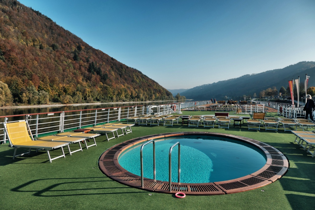 Die Kabine liegt im Souterrain, pardon, Sott Aqua, ein erster Blick aus dem Fenster wird von ein paar arroganten Schwänen von oben herab erwidert. Interessante Perspektive. Erste Erkundung des Schinakkels, das riesige Oberdeck steht voller Liegestühle, vorne ragt die kreisrunde Brücke wie eine Bar aus dem Dach, ein dickes Seil lässt keinen Zweifel daran, dass da vorne gemeine Passagiere nichts zu suchen haben. Dafür dürften sich die mit lustigen Deckspielen die Zeit vertreiben die mir bis dato, bis auf das hier korrekt rechteckige, schmale Putting Green, unbekannt geblieben sind. Und es auch bleiben werden, so weit darf ich schon mal vorgreifen. Aber der weiche Kunstrasen verleitet zum Verweilen, einer der zuvorkommenden Stewards aus Südostasien oder -europa fragt nach Getränkewünschen, gerne, Rotwein, nein, Zweigelt nicht, auch wenn er aus der Gegend kommt die wir durchschippern werden. Alternative wäre der Arosa Hauswein aus Südafrika, passt perfekt ins Konzept auch wenn hier kein Ost bei der Herkunftsbezeichnung mitspielt.