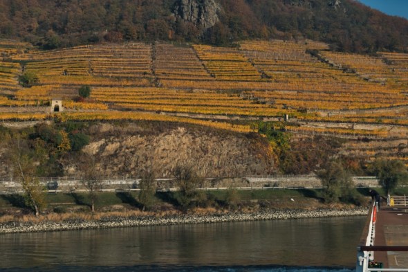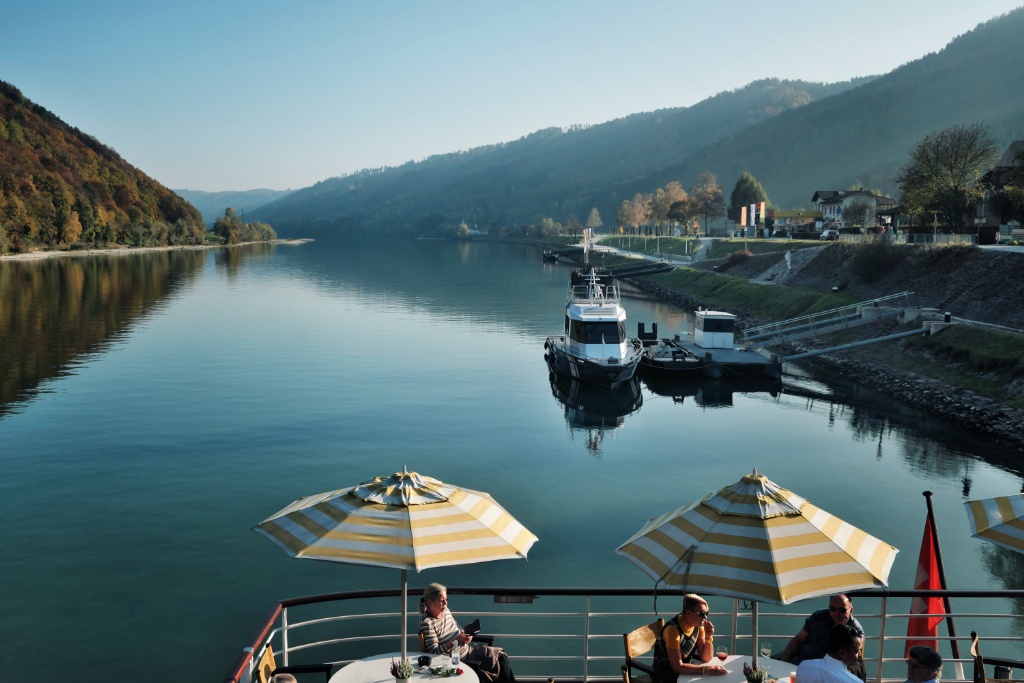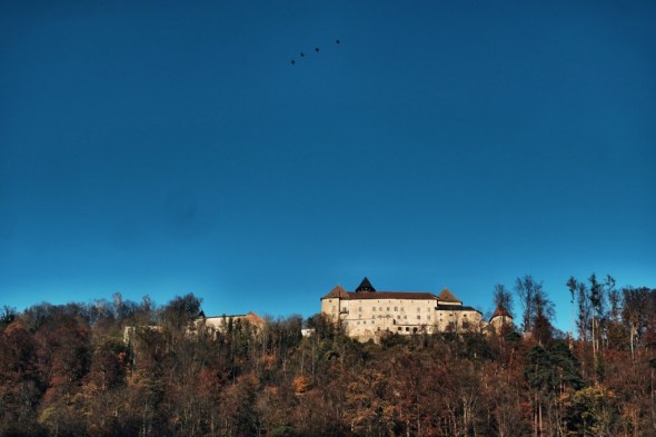 Zu meiner Überraschung gelingt die Drehung des Schiffes ohne Uferkontakt, ziemlich lang wirkt so ein Kahn wenn er in der Donau quer liegt, schließlich ist die hier oben zwischen Mühl- und Innviertel noch pubertierend schmal, erst nach Linz, wo die Abflüsse des Alpenvorlandes münden wird sie zum patriotisch besungenen wenn auch kaum blauen Strome. Wobei: gerade jetzt an diesem einem der letzten strahlenden, sich langsam neigenden Spätherbsttage borgt er sich ein wenig Azur von oben und sieht wirklich prächtig aus. Nur ein bisschen schmal eng noch, dafür kommen die steil und hoch ansteigenden Ufer hervorragend zur Geltung auf denen Burgen wachen zwischen denen das Schiff nun mühelos bergab gleitet. Bis ein paar hundert Meter vor ersten Biegung der Schlögener Schlinge, da kündet leicht gesteigerter Motorenlärm davon, dass der Kapitän das achtzehnhundert Tonnen verdrängende Wasserfahrzeug gerade in die korrekte Fahrtrichtung zu steuern beginnt.