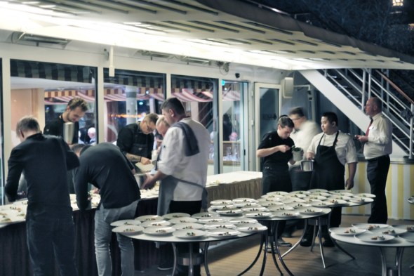 Dass es gar nicht so einfach ist, den Standard seines Restaurants auch in der beengten Kombüse der Arosa Riva auf die Tische zu bringen erkennt man nur an der Tatsache, dass die Gerichte mit geradezu artistischem Geschick auf den Tischen des offenen Achterdecks fertig gestellt werden, zu schmecken ist von der Improvisation jedenfalls nichts. Auch die Brigade von Andreas Senn scheint mit dem Ergebnis recht zufrieden gewesen zu sein, jedenfalls hat sich die Nachbesprechung mit der Bord Crew am Achterdeck noch einige Zeit hingezogen, während das eine oder andere Glas aus Sommelier Christian Buddes Vorräten den Weg ans Heck fand zogen am Ufer die letzten Dörfer der Wachau Stromaufwärts vorbei während die Arosa, Schleuse für Schleuse herabsinkend, näher an Wien herantrieb. Wo anderntags Dirk Seiger vom „Buddenbrooks“ in Travemünde ein nicht weniger beeindruckendes Menü servieren und Patissier Oliver Edelmann einen perfekten Apfelstrudel ins Rohr schieben sollten.