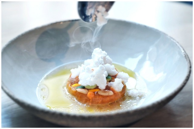 Wo er sich auch endgültig von Fleisch aus Massentierhaltung und Fisch aus bedenklichen Gewässern die er wegen des Kostendrucks kaufen musste verabschiedet hat. Als er vor acht Jahren in Wien begann nach Bezugsquellen für unbedenkliche, ökologisch und ethisch produzierte Produkte zu suchen war das noch zeitaufwendig, mittlerweile ist das kein Problem mehr, „gerade auch die vegetarische Küche hat dazu geführt, dass immer mehr Bauern hier wieder mit der Erde statt gegen sie arbeiten.“ Was man auch bei den Paradeisern schmeckt, die er mit Basilikumöl und gefrorenem Champagner zu einer prickelnden Erfrischung kombiniert. „Die Paradeiser kommen, so wie 80% unserer Zutaten aus der Umgebung von Wien und sind völlig natürlich gewachsen. Das heißt, sie haben auch den Stress gehabt, den eine Pflanze auch braucht, um dichten Geschmack entwickeln zu können so wie wir das vom Wein ja auch kennen.“ Und der Champagner bringt dazu „das Laute und Ausgelassene was eine Großstadt wie Wien nun mal auch auszeichnet“.