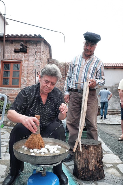 Zu erben gab´s hier stets eine ganze Menge, vor Allem wenn die Familie sich mit der Baumwoll- oder Seidenproduktion beschäftigt hatte. Und wenn die Vorfahren gar in Soufli gelebt haben führte daran eigentlich kein Weg vorbei, im 19 Jahrhundert fand sich in beinahe jedem Haus ein Webstuhl, nach der Eröffnung der Eisenbahnlinie von Alexandroupoli nach Edirne errichtete man auch größere Manufakturen. Der Verlust des Landes jenseits des Evros Flusses mit seinen Maulbeerbaumplantagen nach dem Vertrag von Sévres und das Vordringen der Kunstfaser läuteten das Ende des goldenen Zeitalters ein. Wie dieses ausgesehen hat zeigt das Volkskundemuseum der Familie Bourouliti sehr eindrücklich, ganz der Geschichte der Seidenherstellung hat sich das Silk Museum verschrieben, dort staunt man über die unglaubliche Länge des Seidenfadens eines Kokons von fast einem Kilometer und erst recht über das lächerlich geringe Gewicht. Gesponnen wird natürlich noch immer, nicht nur im Museum, auch die Luxusmarkenindustrie hat natürlich diese einzige noch existierende europäische Seidenstadt und ihre exklusiven Gewebe wiederentdeckt.