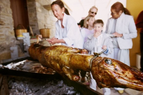 Nach dem Gottesdienst gibt´s, endlich, was zu essen. Man zieht sich in den Kreis der Familie zurück, um nach der langen Fastenzeit die traditionellen Speisen zu sich zu nehmen: wie bei uns werden rote Eier gepeckt, auch Schinken und Brot gibt es, aber worum sich vorerst alles dreht ist die Majeritza. Eine Suppe, zubereitet aus den Eingeweiden des Lammes, das wir morgen speisen werden. Angeblich ist sie nicht bei allen gleich beliebt, aber kein Grieche würde dies zugeben, und die Höflichkeit gebietet Zustimmung, sollte einem die Ehre zuteil werden, als Gast an einem Ostermal teilzunehmen.